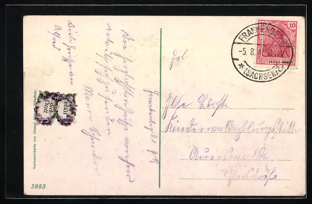 Personenbezogene Daten auf der Rückseite der Karte wurden durch blauen Textmarker unkenntlich gemacht. Die blauen Stellen sind auf die Vorderseite durchgeweicht und wirken sich negativ auf das Postkartenfoto aus