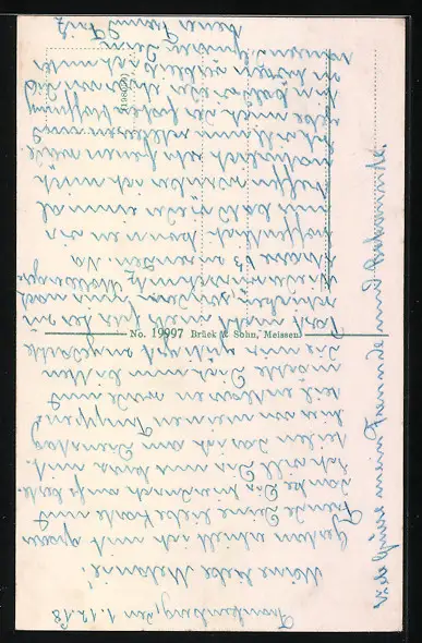 Personenbezogene Daten auf der Rückseite der Karte wurden durch blauen Textmarker unkenntlich gemacht. Die blauen Stellen sind auf die Vorderseite durchgeweicht und wirken sich negativ auf das Postkartenfoto aus