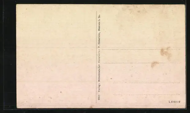 Personenbezogene Daten auf der Rückseite der Karte wurden durch blauen Textmarker unkenntlich gemacht. Die blauen Stellen sind auf die Vorderseite durchgeweicht und wirken sich negativ auf das Postkartenfoto aus