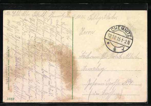 Personenbezogene Daten auf der Rückseite der Karte wurden durch blauen Textmarker unkenntlich gemacht. Die blauen Stellen sind auf die Vorderseite durchgeweicht und wirken sich negativ auf das Postkartenfoto aus