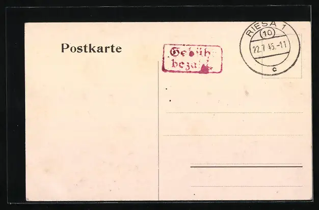 Personenbezogene Daten auf der Rückseite der Karte wurden durch blauen Textmarker unkenntlich gemacht. Die blauen Stellen sind auf die Vorderseite durchgeweicht und wirken sich negativ auf das Postkartenfoto aus