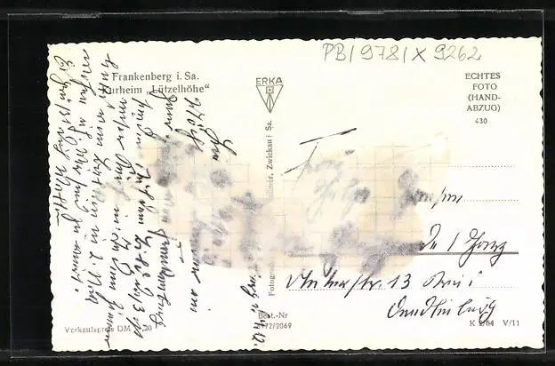 Personenbezogene Daten auf der Rückseite der Karte wurden durch blauen Textmarker unkenntlich gemacht. Die blauen Stellen sind auf die Vorderseite durchgeweicht und wirken sich negativ auf das Postkartenfoto aus