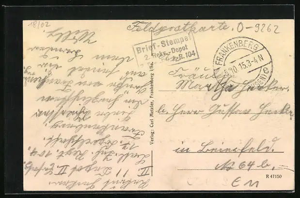Personenbezogene Daten auf der Rückseite der Karte wurden durch blauen Textmarker unkenntlich gemacht. Die blauen Stellen sind auf die Vorderseite durchgeweicht und wirken sich negativ auf das Postkartenfoto aus