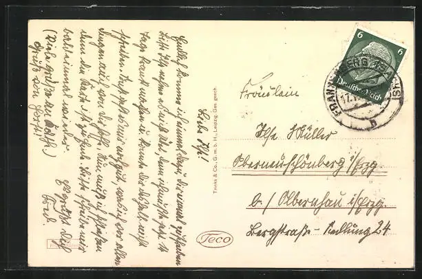 Personenbezogene Daten auf der Rückseite der Karte wurden durch blauen Textmarker unkenntlich gemacht. Die blauen Stellen sind auf die Vorderseite durchgeweicht und wirken sich negativ auf das Postkartenfoto aus