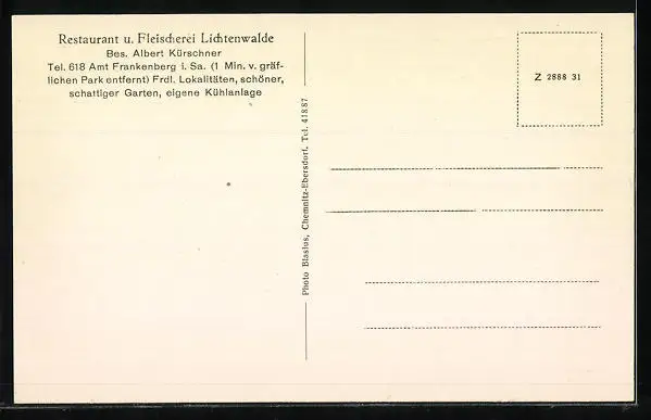 AK Frankenberg i. Sa., Restaurant u. Fleischerei Lichtenwalde