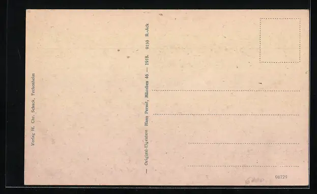 Personenbezogene Daten auf der Rückseite der Karte wurden durch blauen Textmarker unkenntlich gemacht. Die blauen Stellen sind auf die Vorderseite durchgeweicht und wirken sich negativ auf das Postkartenfoto aus