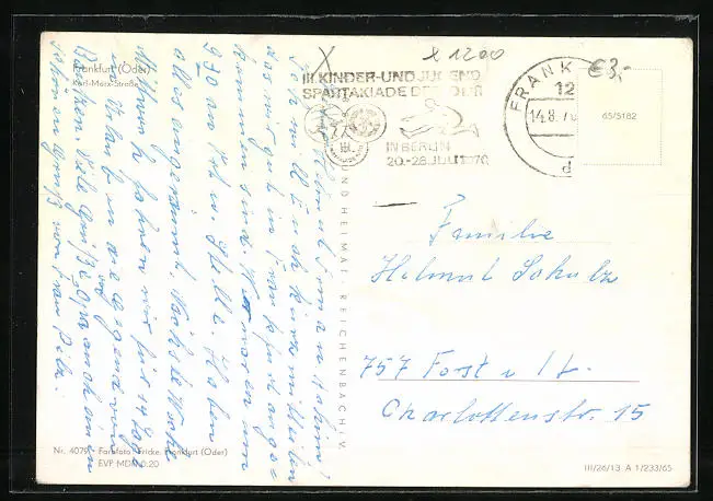 Personenbezogene Daten auf der Rückseite der Karte wurden durch blauen Textmarker unkenntlich gemacht. Die blauen Stellen sind auf die Vorderseite durchgeweicht und wirken sich negativ auf das Postkartenfoto aus