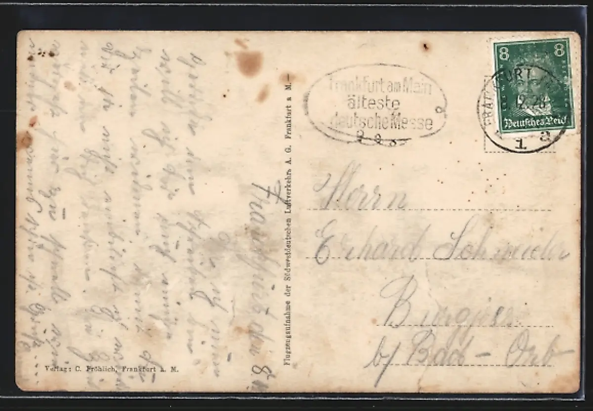 Personenbezogene Daten auf der Rückseite der Karte wurden durch blauen Textmarker unkenntlich gemacht. Die blauen Stellen sind auf die Vorderseite durchgeweicht und wirken sich negativ auf das Postkartenfoto aus