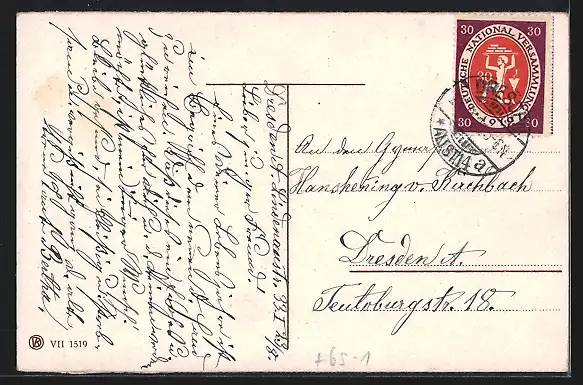 Personenbezogene Daten auf der Rückseite der Karte wurden durch blauen Textmarker unkenntlich gemacht. Die blauen Stellen sind auf die Vorderseite durchgeweicht und wirken sich negativ auf das Postkartenfoto aus