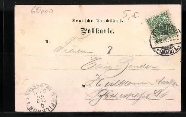 Personenbezogene Daten auf der Rückseite der Karte wurden durch blauen Textmarker unkenntlich gemacht. Die blauen Stellen sind auf die Vorderseite durchgeweicht und wirken sich negativ auf das Postkartenfoto aus