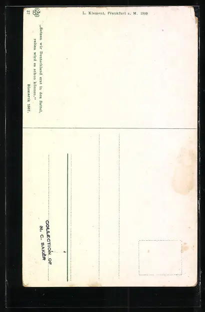 Personenbezogene Daten auf der Rückseite der Karte wurden durch blauen Textmarker unkenntlich gemacht. Die blauen Stellen sind auf die Vorderseite durchgeweicht und wirken sich negativ auf das Postkartenfoto aus