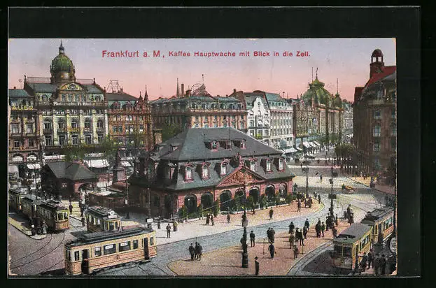 AK Frankfurt a. M., Café Hauptwache mit Blick in die Zeil, Strassenbahn