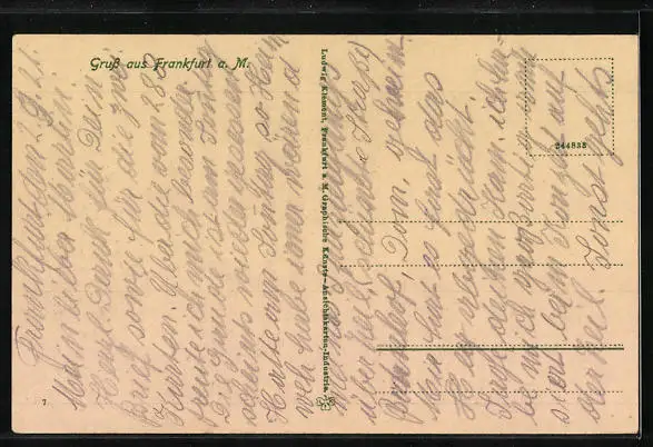Personenbezogene Daten auf der Rückseite der Karte wurden durch blauen Textmarker unkenntlich gemacht. Die blauen Stellen sind auf die Vorderseite durchgeweicht und wirken sich negativ auf das Postkartenfoto aus