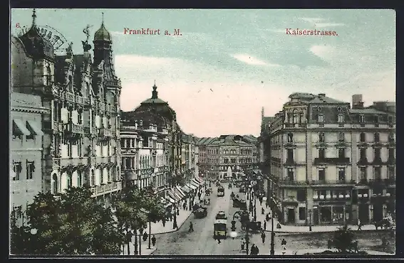 AK Frankfurt a. M., Kaiserstrasse mit Strassenbahnen aus der Vogelschau