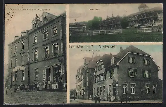 AK Frankfurt a. M.-Niederrad, Geschäftshaus v. Friedr. Neumann, Rennbahn, Post u. Polizeiamt