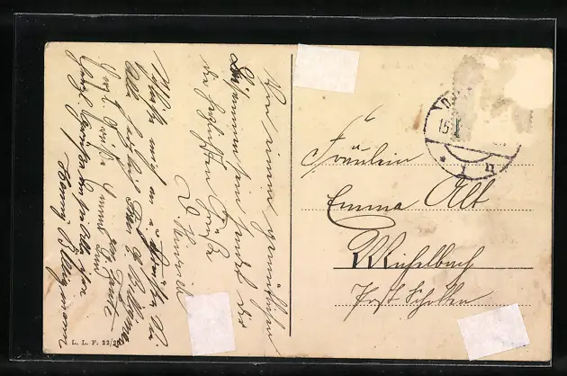 alte Ansichtskarte, gelaufen, rückseitig Klebe- und Papierreste, Briefmarke entfernt, rückseitig Oberflächenschaden, Bugspur links