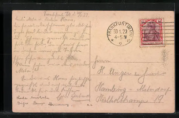alte Ansichtskarte, gelaufen 1922, Eckknicke li. oben u. re. unten, Stempelspur, guter Zustand