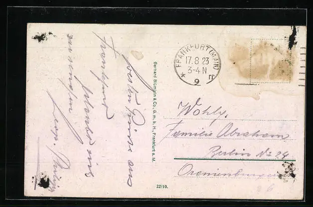 gelaufen 1923, Briefmarke entfernt, rückseitig Oberflächenschaden, rückseitig Klebe- und Papierreste, Eckknick li. unten, guter Zustand