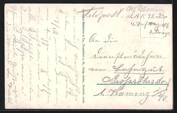 Personenbezogene Daten auf der Rückseite der Karte wurden durch blauen Textmarker unkenntlich gemacht. Die blauen Stellen sind auf die Vorderseite durchgeweicht und wirken sich negativ auf das Postkartenfoto aus
