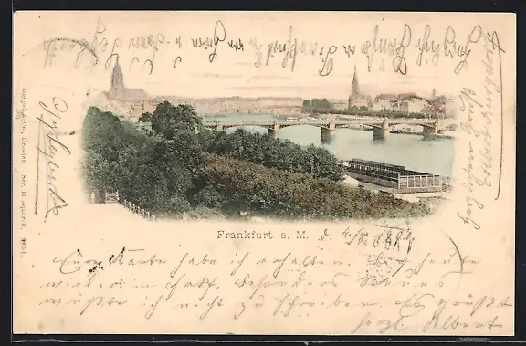 AK Frankfurt a. M., Teilansicht mit Mainbrücke aus der Vogelschau
