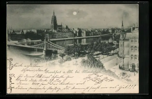 AK Frankfurt a. M., Uferpartie mit Kirche bei Mondschein