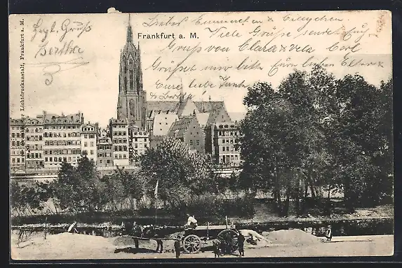 AK Frankfurt a. M., Uferpartie mit Kirche und Pferdewagen