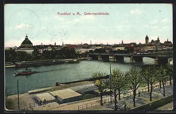 AK Frankfurt a. M., Untermainbrücke mit Stadtpanorama