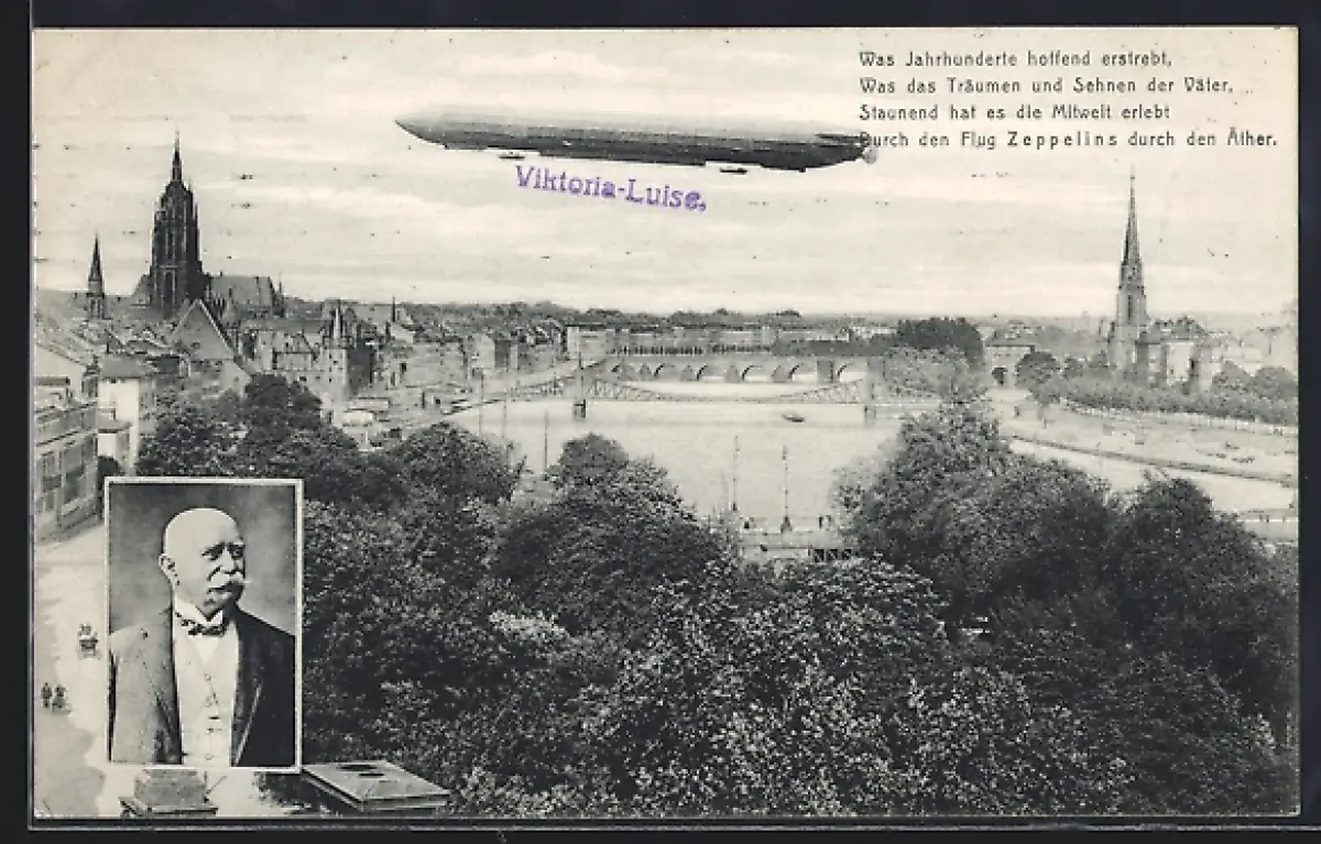 AK Frankfurt a. Main, Luftschiff Zeppelin im Flug, Portrait Graf v. Zeppelin