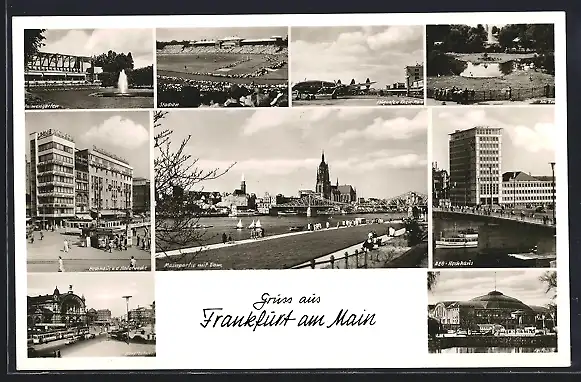 AK Frankfurt am Main, AEG-Hochhaus, Mainpartie mit Dom, Palmengarten