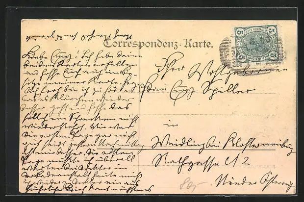 Personenbezogene Daten auf der Rückseite der Karte wurden durch blauen Textmarker unkenntlich gemacht. Die blauen Stellen sind auf die Vorderseite durchgeweicht und wirken sich negativ auf das Postkartenfoto aus