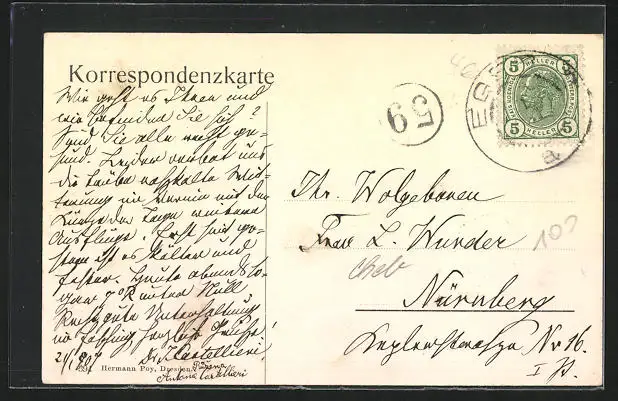 alte Ansichtskarte, gelaufen 1907, Eckknicke li. oben u. re. unten, Stempelspur, guter Zustand