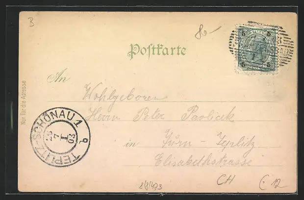 gelaufen 1903, Eckknick re. oben, Stempelspur, guter Zustand