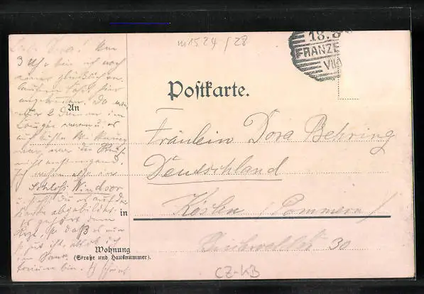 Personenbezogene Daten auf der Rückseite der Karte wurden durch blauen Textmarker unkenntlich gemacht. Die blauen Stellen sind auf die Vorderseite durchgeweicht und wirken sich negativ auf das Postkartenfoto aus