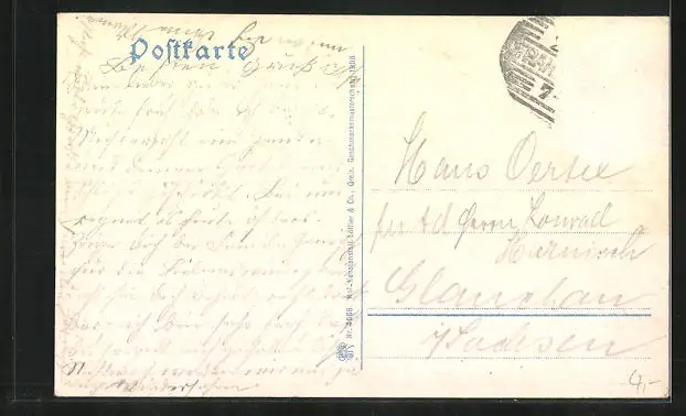 Personenbezogene Daten auf der Rückseite der Karte wurden durch blauen Textmarker unkenntlich gemacht. Die blauen Stellen sind auf die Vorderseite durchgeweicht und wirken sich negativ auf das Postkartenfoto aus