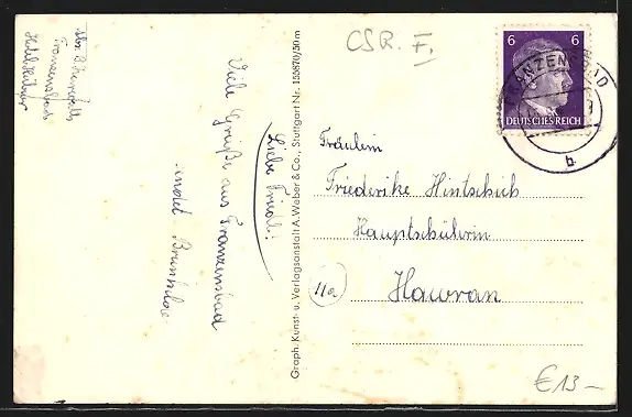 Personenbezogene Daten auf der Rückseite der Karte wurden durch blauen Textmarker unkenntlich gemacht. Die blauen Stellen sind auf die Vorderseite durchgeweicht und wirken sich negativ auf das Postkartenfoto aus