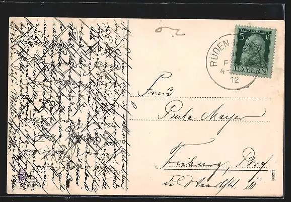 Personenbezogene Daten auf der Rückseite der Karte wurden durch blauen Textmarker unkenntlich gemacht. Die blauen Stellen sind auf die Vorderseite durchgeweicht und wirken sich negativ auf das Postkartenfoto aus
