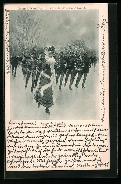 AK Frau auf Schlittschuhen vor Soldaten auf der Eisbahn
