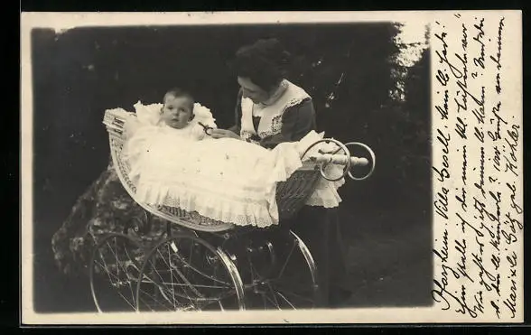 AK Frau gibt einem Baby im Kinderwagen einen Schnuller