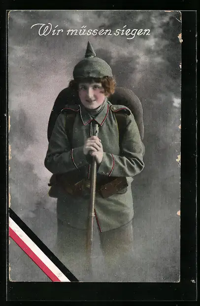 AK Frau in Feldgrau mit Rucksack