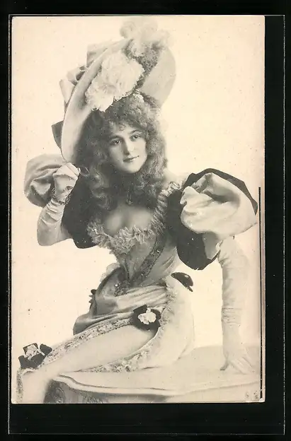 AK Frau in Kleid mit Puffärmeln und breitkrempigem Hut