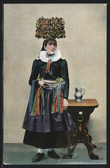 AK Frau in Schwarzwälder Tracht an einem Tisch