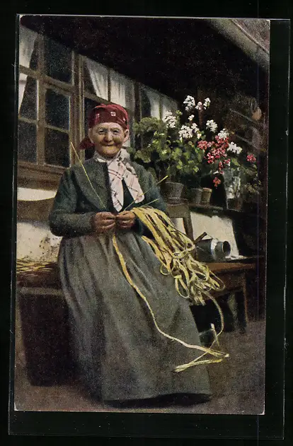 AK Frau in Schwarzwälder Tracht beim Korbflechten