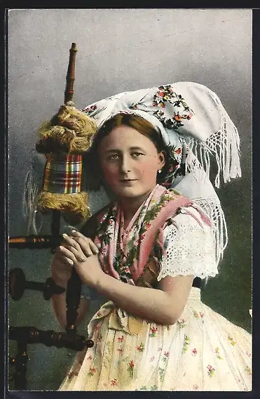 AK Frau in Spreewälder Tracht an Spindel