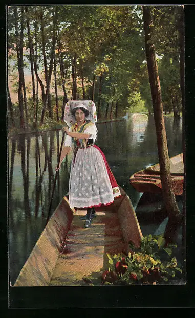 AK Frau in Spreewälder Tracht bei einer Kahnfahrt