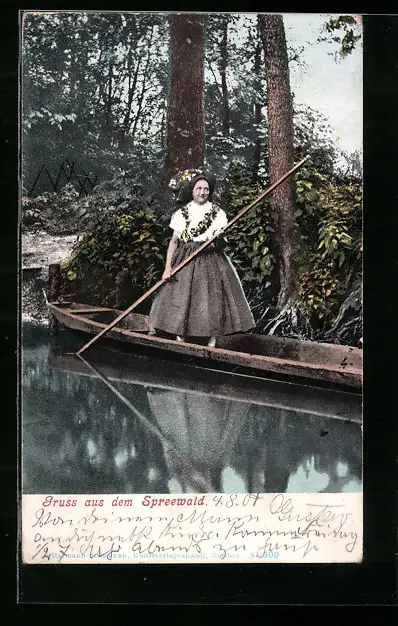 AK Frau in Spreewälder Tracht in einem Spreewald-Kahn