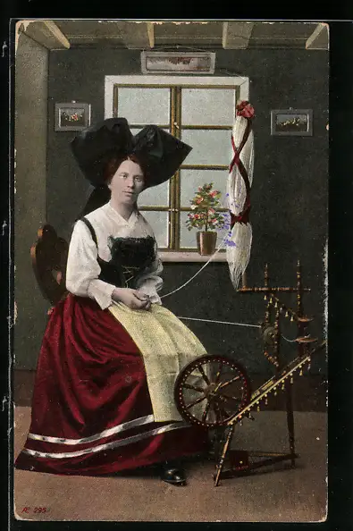 AK Frau in elsass-lothringischer Tracht am Spinnrad