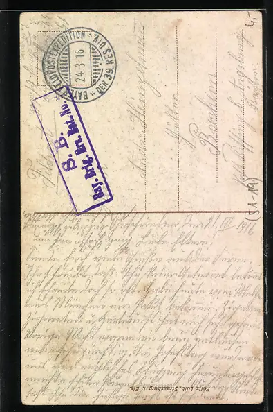 Personenbezogene Daten auf der Rückseite der Karte wurden durch blauen Textmarker unkenntlich gemacht. Die blauen Stellen sind auf die Vorderseite durchgeweicht und wirken sich negativ auf das Postkartenfoto aus