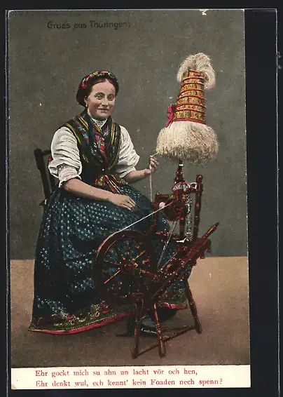 AK Frau in thüringischer Tracht am Spinnrad
