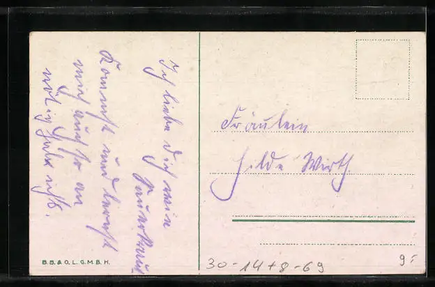 Personenbezogene Daten auf der Rückseite der Karte wurden durch blauen Textmarker unkenntlich gemacht. Die blauen Stellen sind auf die Vorderseite durchgeweicht und wirken sich negativ auf das Postkartenfoto aus