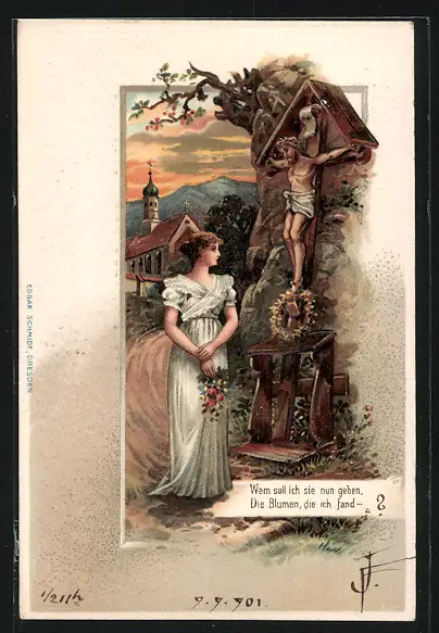 AK Frau mit Blumen vor Flurkreuz, Im Hintergrund Kirche